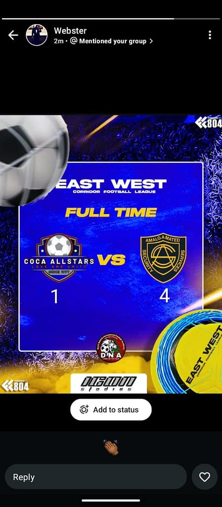 Amalgamated Security Services Limited proudly celebrates its first-ever win in the East/West Football League, marking an exciting milestone for the team. The historic victory came during a thrilling match against the COCA Allstars on Sunday, January 11, 2026, at the Larry Gomes Stadium.