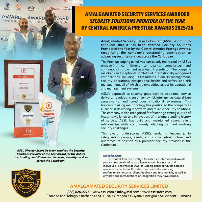 Amalgamated Security Services Limited (ASSL) has been officially recognised as Security Solutions Provider of the Year by the Central America Prestige Awards, an international awards programme that celebrates excellence, innovation, and leadership across industries. This prestigious accolade highlights ASSL’s position as one of the Caribbean’s most trusted and comprehensive security and risk management organisations, delivering […]